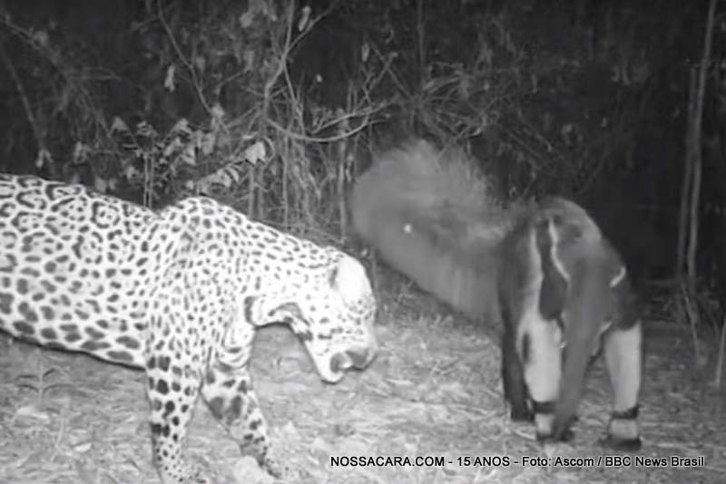 "Monitoramos a onça-pintada há oito anos. Nesse período, só avistamos a onça tentando predar tamanduá umas cinco vezes - e ela só teve sucesso uma vez", diz Mário Haberfeld, coordenador do Onçafari. Nas imagens registradas pelo projeto, o tamanduá repele a aproximação de uma onça fêmea com cerca de dois anos, conhecida pela equipe do projeto como Xereta.