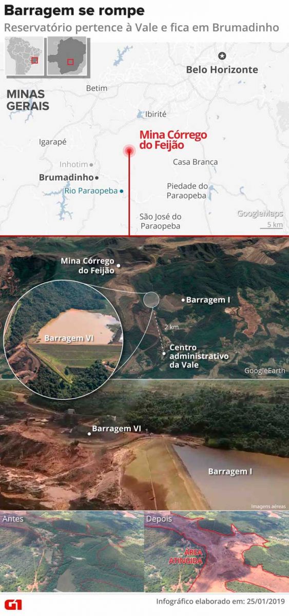O rompimento ocorreu no início da tarde de sexta-feira (25), na Mina Feijão. A Vale informou que uma barragem rompeu e fez outra transbordar. Um mar de lama destruiu casas da região. Rejeitos atingiram a área administrativa da companhia e parte da comunidade de Vila Ferteco. O acesso a Brumadinho pela rodovia BR-040 está bloqueado.