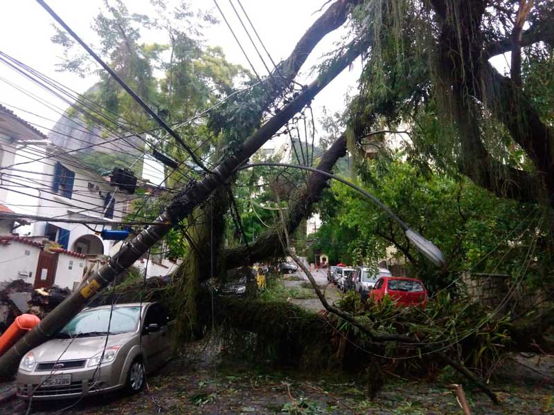 Pelo menos três pessoas morreram e duas estão desaparecidas depois da tempestade da noite da quarta-feira (6) no Grande Rio. A forte chuva acompanhada de ventania causou apagões, derrubou árvores, alagou vias e fechou a Avenida Niemeyer, onde trecho da ciclovia desabou.