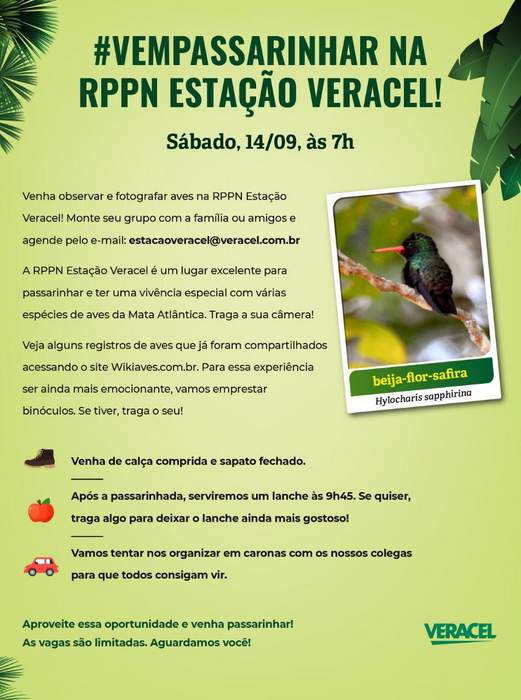 A RPPN Estação Veracel promove no sábado, dia 14 mais uma passarinhada venham participar?