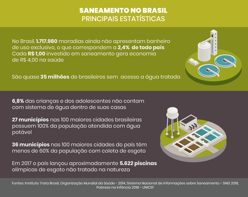 Todo ano, o Instituto apresenta um ranking com o desempenho das 100 maiores cidades brasileiras em relação aos serviços prestados no setor. Segundo o levantamento feito no início deste ano, mais de 35 milhões de pessoas ainda não têm água e mais de 100 milhões ainda não dispõem de cobertura da coleta de esgoto. Dados do Sistema Nacional de Informações sobre Saneamento de 2018 mostram, ainda, que apenas 46% do volume de esgoto gerado no Brasil é tratado.
