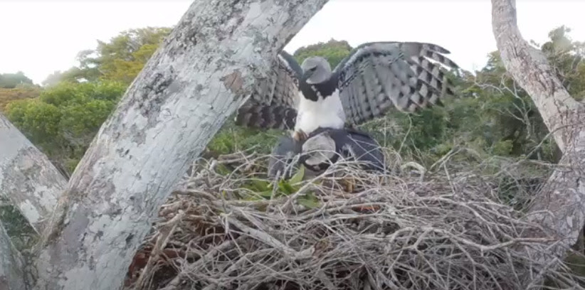 Eunápolis, 20 de abril de 2021 - Em um registro extremamente raro, um casal de harpias foi filmado em um momento de cópula na Reserva Particular do Patrimônio Natural (RPPN) Estação Veracel, localizada nos municípios de Porto Seguro e Santa Cruz Cabrália, no Sul da Bahia. As imagens foram capturadas no último mês a partir de um dos dois ninhos monitorados pelo Projeto Harpia na RPPN. É a primeira vez em que uma cópula é registrada em vídeo desde o início do monitoramento nesta reserva com mais de de 6.000 hectares na Mata Atlântica. Veja aqui o vídeo completo.