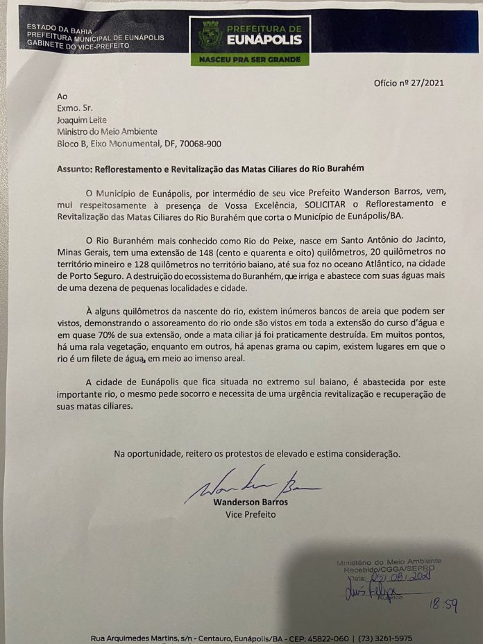 AS INFORMAÇÕES SÃO DO SAIU NA MÍDIA – No intuito de reflorestar e revitalizar as matas ciliares do Rio Buranhém (conhecido como Rio do Peixe), o vice-prefeito de Eunápolis, Wanderson Barros (PSL), protocolou na quinta-feira (05/08), um ofício junto ao Ministério do Meio Ambiente em Brasília.
