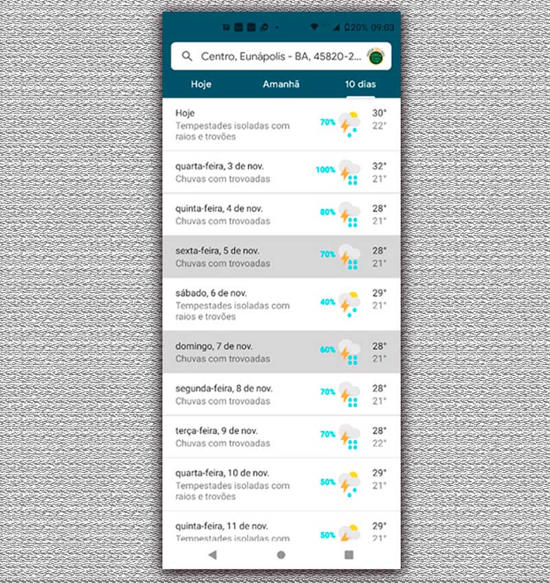 Não se descarta chuva pontualmente forte, principalmente sobre a faixa leste da Bahia, o que inclui a região do litoral e a capital Salvador. São previstos volumes significativos de chuva no decorrer desta terça-feira, 2 de novembro, feriado de Finados.