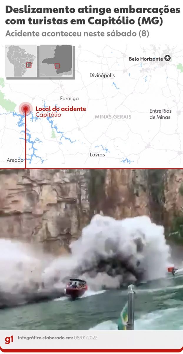 Um deslizamento de pedras no Lago de Furnas, em Capitólio, no Centro-Oeste de Minas, atingiu três embarcações com turistas neste sábado (8).