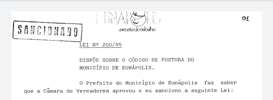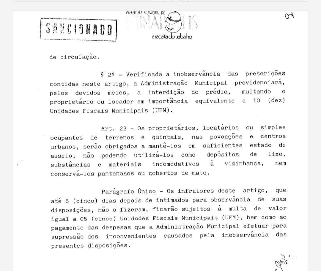 Autorização para tanto encontra-se no artigo 22 e seu parágrafo único da lei de número 200 de 19 de janeiro de 1995, assinada pelo ex-prefeito Feruk Felipe Abrãao. O Código de Posturas de 95 define que “os proprietários, locatários ou simples ocupantes de terrenos e quintais, nas povoações e centros urbanos, são obrigados a mantê-los limpos e sem materiais, lixo ou substâncias que possam incomodar à vizinhança”.