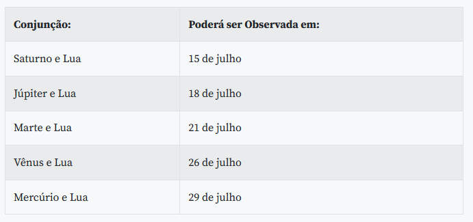Além das observações, o mês também reserva eventos astronômicos para aqueles que possuem crenças relacionadas ao posicionamento dos astros. Saturno, Júpiter, Mercúrio, Marte e Vênus terão conjunções lunares que poderão ser observadas no céu da manhã. Veja o calendário da Nasa:
