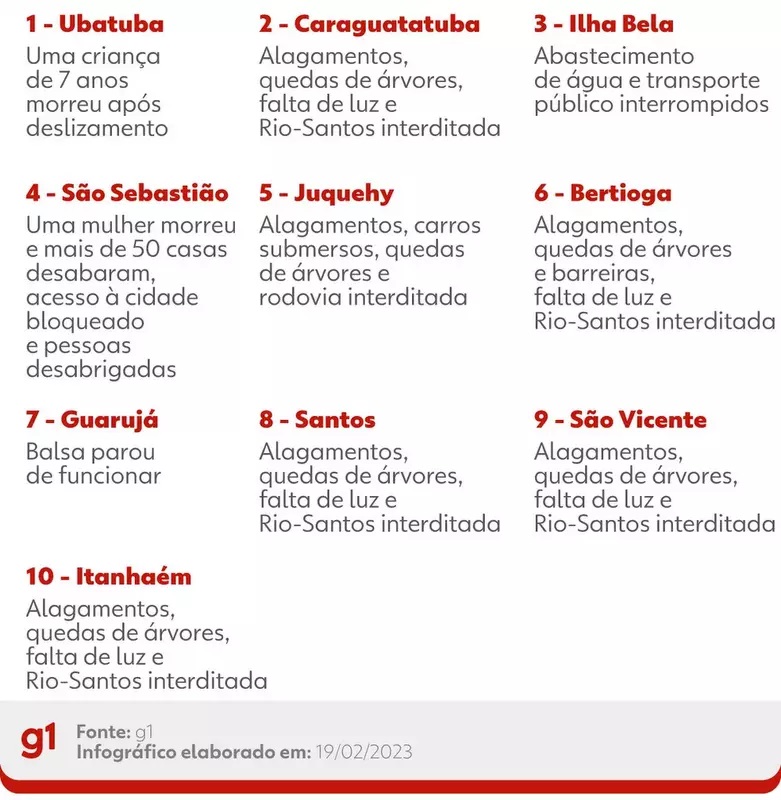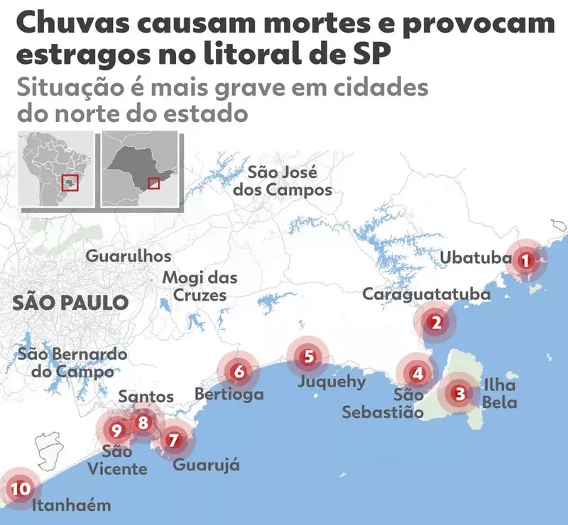 O prefeito de São Sebastião, Felipe Augusto (PSDB), disse, neste domingo (19), que 50 casas foram soterradas na cidade após o temporal que matou pelo menos 19 pessoas no litoral paulista.