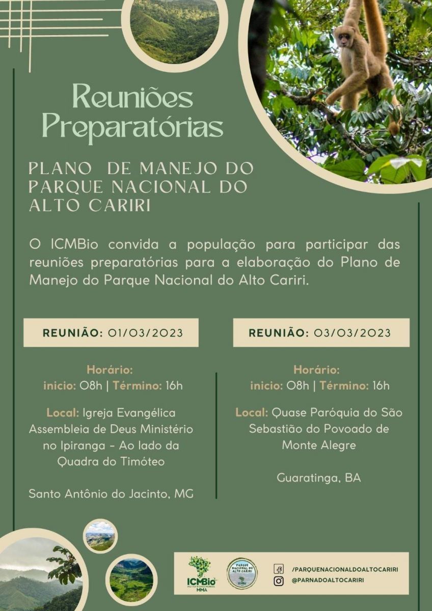 As Reuniões preparatórias tem o objetivo de realizar levantamentos necessários antes da oficina de elaboração do plano de manejo. As reuniões são para esclarecimento sobre o processo de elaboração do plano de manejo do Parque Nacional do Alto Cariri, deixando claro o quanto é importante a participação da sociedade na construção desse documento.