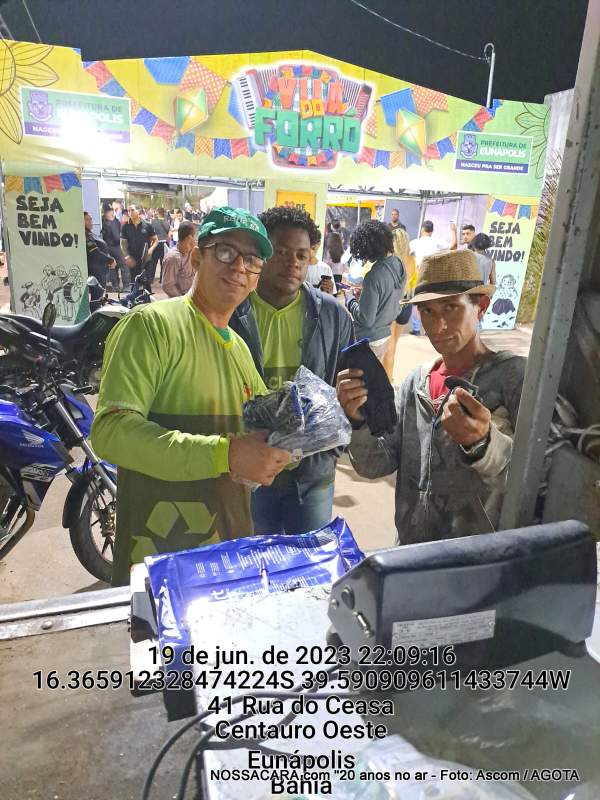 Projeto da Coleta Seletiva Solidária de Materiais Recicláveis no São João e São Pedro em Eunápolis e Porto Seguro realizado pela AGO – Associação Gota do Óleo (associação de catadores e catadoras de materiais recicláveis) com patrocínio da Secretaria Estadual do Trabalho, Emprego, Renda e Esporte – SETRE, Secretaria Estadual de Meio Ambiente – SEMA, Instituto do Meio Ambiente e Recursos Hídricos – INEMA, do Governo do Estado da Bahia, FUNTRAD e apoio do Movimento Nacional dos Catadores de Materiais Recicláveis – MNCR BA, Fórum Lixo & Cidadania – Bahia, Prefeitura Municipal de Porto Seguro, Awê Recicla, Recicla Sul da Bahia, Ambient See, COOPERA PORTO, COONAPOLIS, Projeto Musicart e Gráfica Mais.