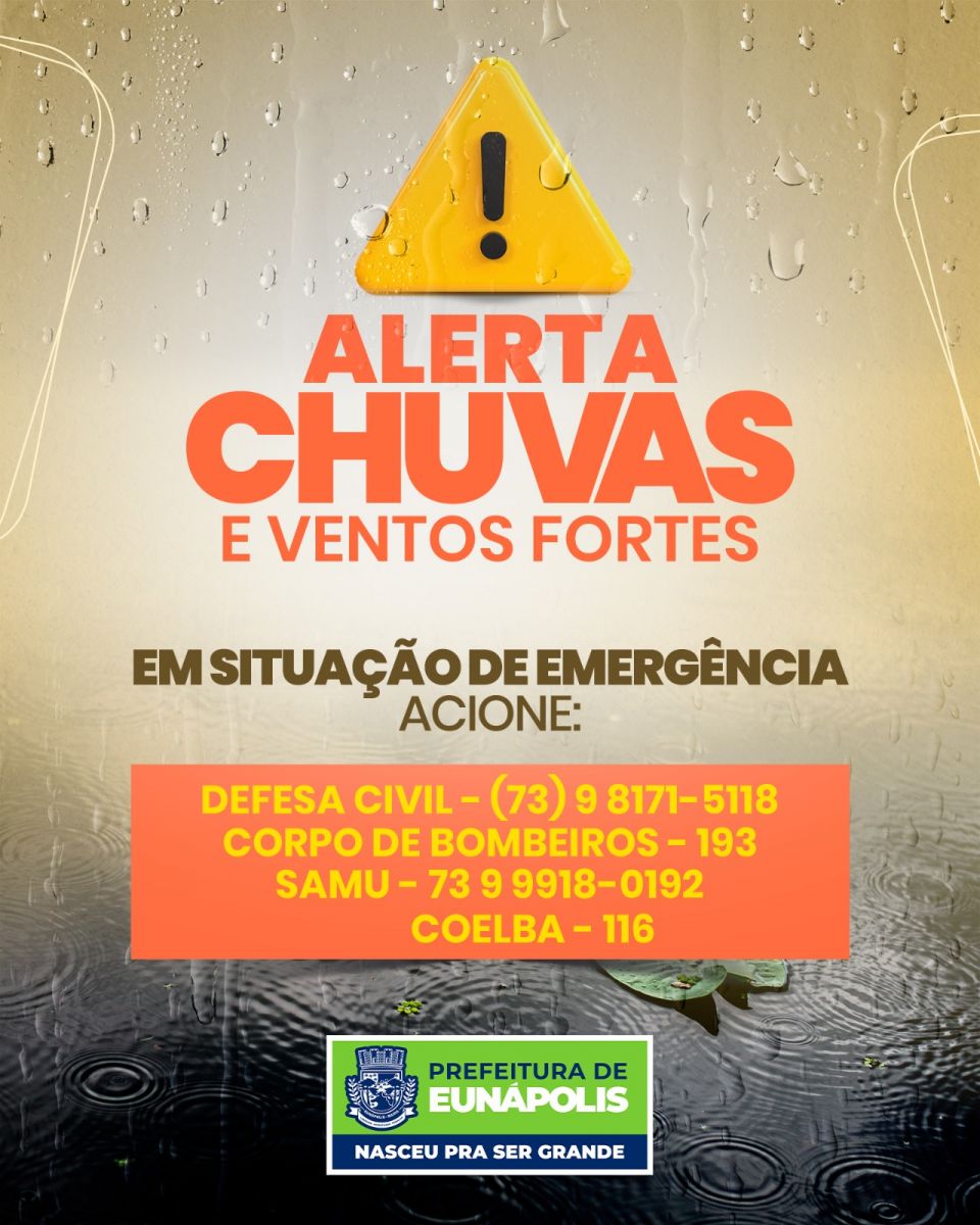 Eunápolis, (28) - A Defesa Civil de Eunápolis emitiu um comunicado urgente à população, alertando sobre a previsão de condições climáticas adversas a partir desta segunda-feira. Segundo as informações meteorológicas, a região poderá ser afetada por fortes chuvas e ventos intensos nas próximas horas.