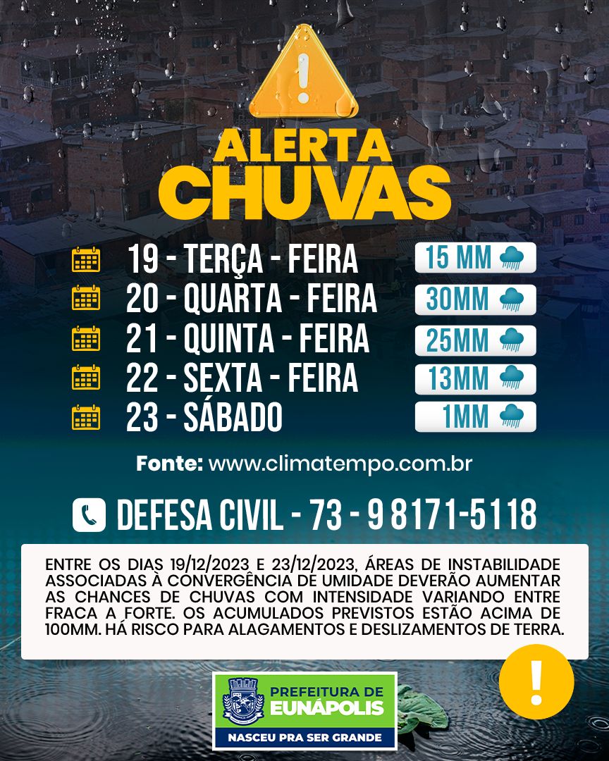 A Prefeitura de Eunápolis chama a atenção da população para as condições climáticas previstas para o município de terça-feira (19) a sábado (23).