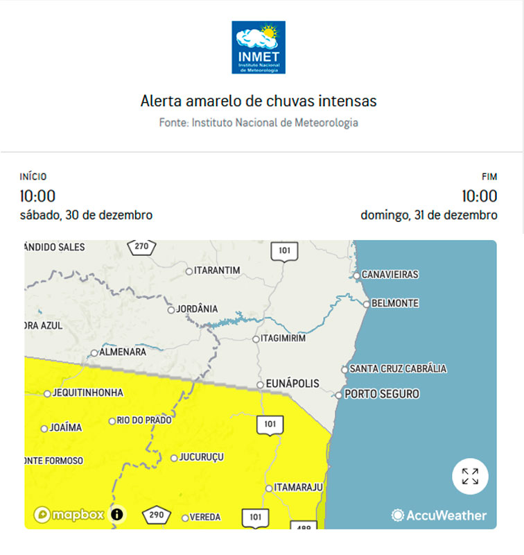 INMET publica aviso iniciando em: 30/12/2023 10:00. Chuva entre 20 e 30 mm/h ou até 50 mm/dia, ventos intensos (40-60 km/h). Baixo risco de corte de energia elétrica, queda de galhos de árvores, alagamentos e de descargas elétricas. Em caso de rajadas de vento: (não se abrigue debaixo de árvores, pois há leve risco de queda e descargas elétricas e não estacione veículos próximos a torres de transmissão e placas de propaganda). Evite usar aparelhos eletrônicos ligados à tomada. Obtenha mais informações junto à Defesa Civil (telefone 199) e ao Corpo de Bombeiros (telefone 193).
