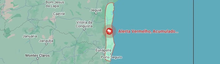 Todos os municípios da Bahia podem receber chuvas nas próximas horas. Um destes alertas, de cor vermelha, representa grande perigo para acumulados excessivos de chuva em uma faixa do litoral sul da Bahia, abrangendo 44 municípios.
