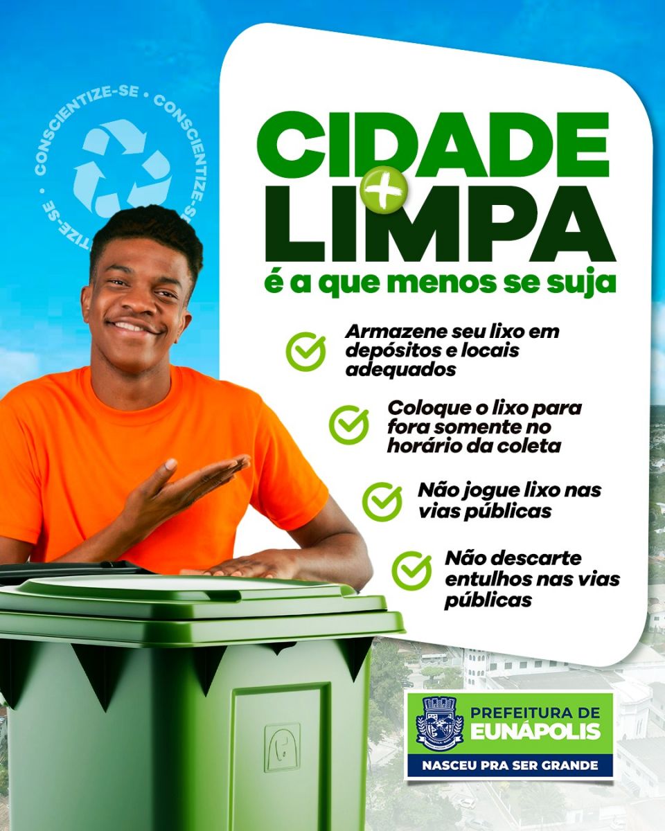 A Prefeitura de Eunápolis lança a campanha "Cidade Mais Limpa é a que Menos se Suja" para reforçar a necessidade urgente de conscientização da comunidade sobre o correto descarte do lixo, principalmente durante o período chuvoso, visando prevenir alagamentos decorrentes da obstrução de sistemas de drenagem e outros transtornos.