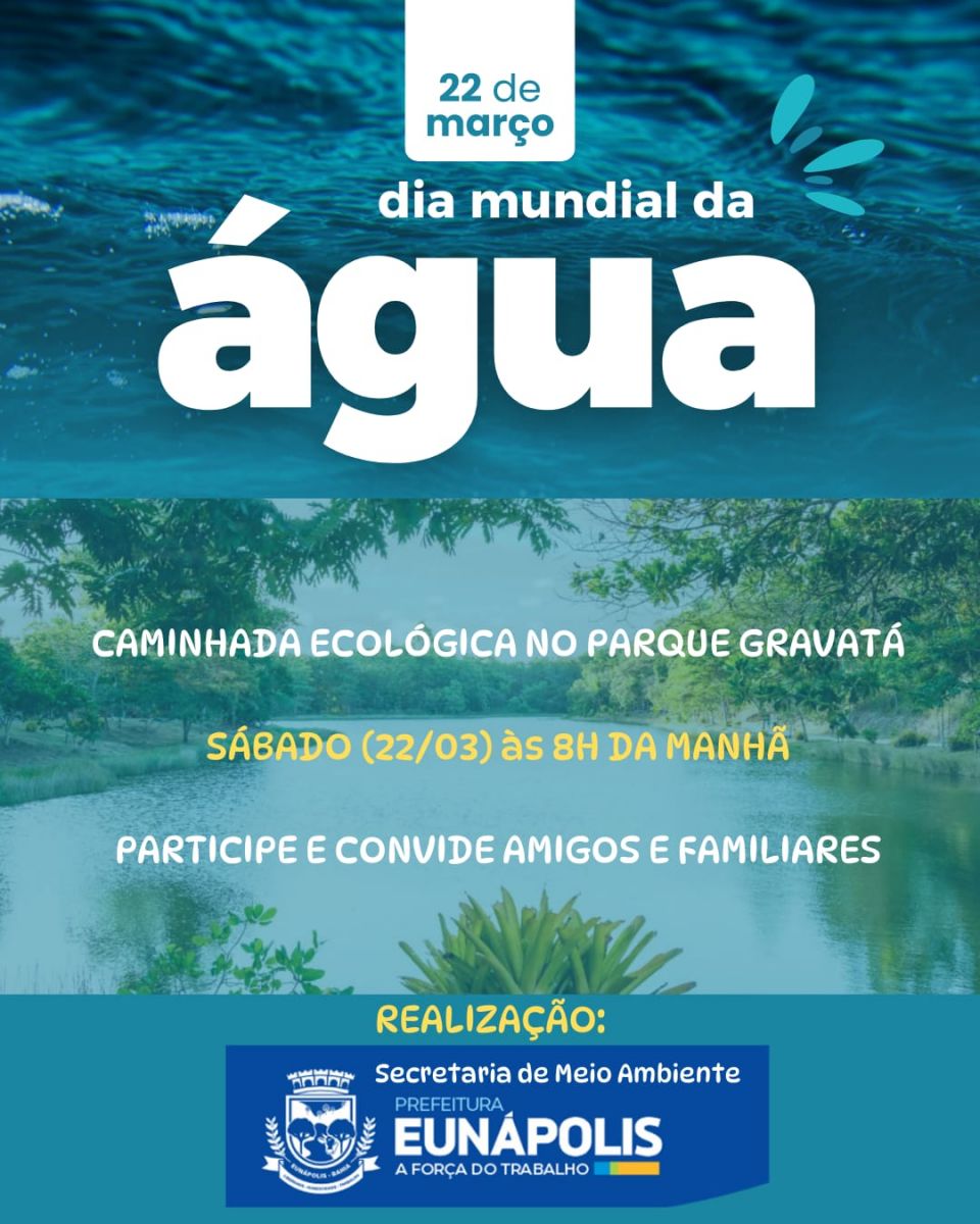 A Secretaria de Meio Ambiente de Eunápolis vai comemorar o Dia Mundial da Água, no sábado, 22 de março, a partir das 8hs, com uma Caminhada Ecológica no Parque do Gravatá.