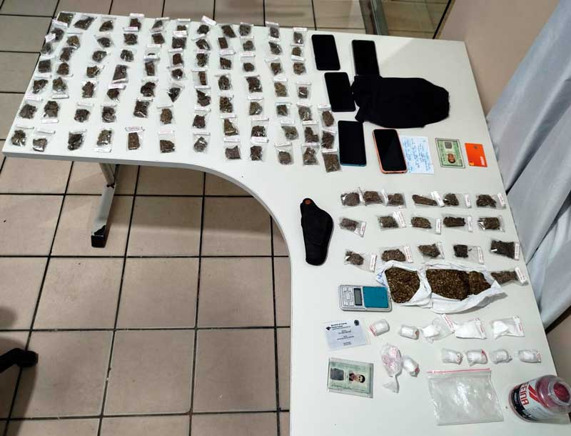 Com apoio da CIPE Mata Atlântica, os policiais se deslocaram até uma residência na Rua Rio Mucuri, onde foram apreendidos mais 17 pedaços de substância análoga à maconha, dois maiores prensados, sete frascos e três porções de substância análoga à cocaína, além de balança de precisão, coldre, medicamentos usados na mistura da droga, documentos e celulares.