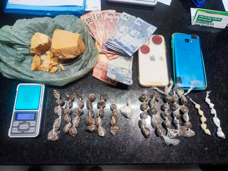 Durante abordagem, com o menor foi localizado 25 buchas de maconha, 7 pedras de crack, 5 trouxas de cocaína, R$137,00 em cédulas e 1 aparelho Samsung cor azul e com o outro individuo uma sacola contendo 29 buchas de maconha, 1 porção de cocaína, 2 pedras grandes de crack, 1 aparelho smartphone iPhone 11, 1 balança de precisão e R$37,00 em cédulas.