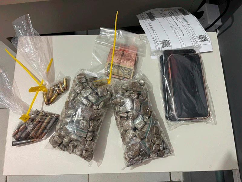 No imóvel onde o suspeito foi localizado, os policiais também encontraram J.S.J., de 21 anos. Ambos foram flagrados com uma grande quantidade de drogas semelhante à maconha, além de diversas munições de uso restrito, incluindo munições de fuzil calibre 5.56 e de pistola 9 mm.