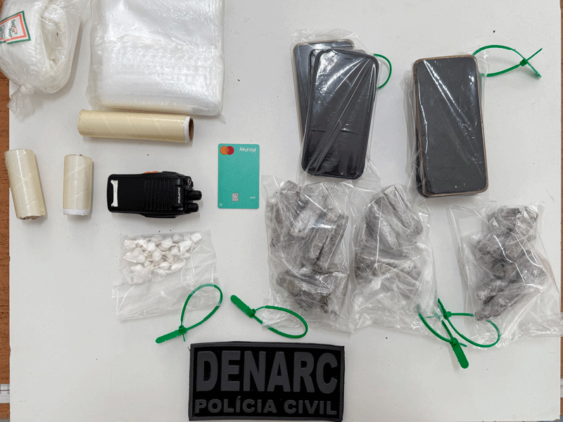 Os policiais realizaram acompanhamento e conseguiram conter o indivíduo, V.S.M. Com ele e no interior do segundo imóvel para o qual o mesmo havia fugido foram encontradas substâncias entorpecentes — cocaína e maconha — além de materiais utilizados no acondicionamento e distribuição de drogas, tais como embalagens plásticas, rádio comunicador e aparelhos celulares.
