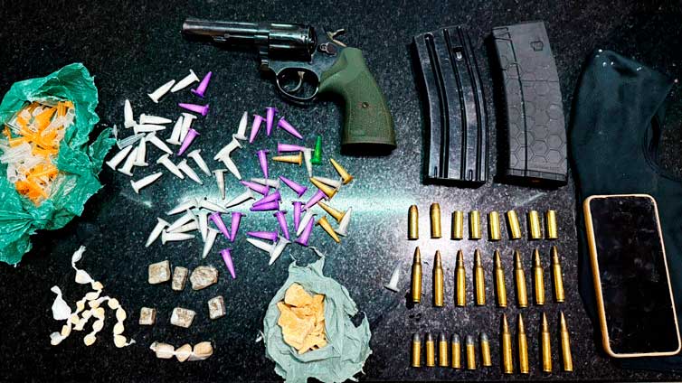 Durante o acompanhamento, alguns indivíduos invadiram uma casa, ocorrendo um segundo confronto, sendo necessário o revide a injusta agressão. Cessados os disparos, um indivíduo, neutralizado, foi encontrado com um revólver Taurus cal.38 num. raspada e uma mochila contendo 62 pinos de cocaina 39g,