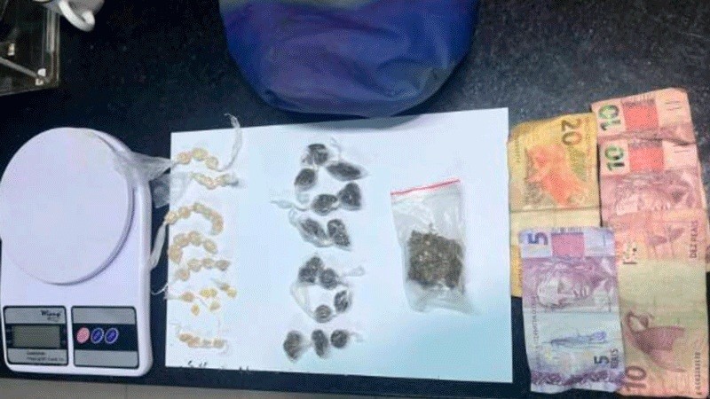 Diante da fundada suspeita procedeu-se a abordagem, sendo localizado na bolsa uma balança de precisão, 31 pedras de crack, um pedaço de maconha (8,84gr), 14 buchas de maconha.