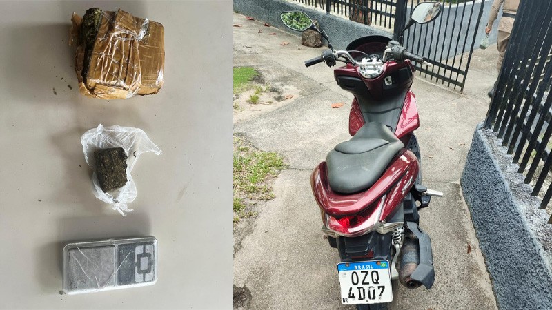 Durante a abordagem pessoal, foi encontrada com o suspeito uma porção de substância análoga à maconha. Na sequência, em vistoria realizada no compartimento “baú” da motocicleta, os policiais localizaram uma porção maior da mesma substância, além de uma balança de precisão. Ao todo, foram apreendidos aproximadamente 350 gramas de maconha.