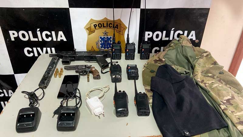 No local, foram apreendidas armas de fogo, entre elas uma submetralhadora e um revólver, além de aparelhos de comunicação. Todo o material foi apresentado na unidade policial para adoção das medidas legais cabíveis. As diligências seguem em andamento para identificar e localizar outros integrantes do grupo criminoso.