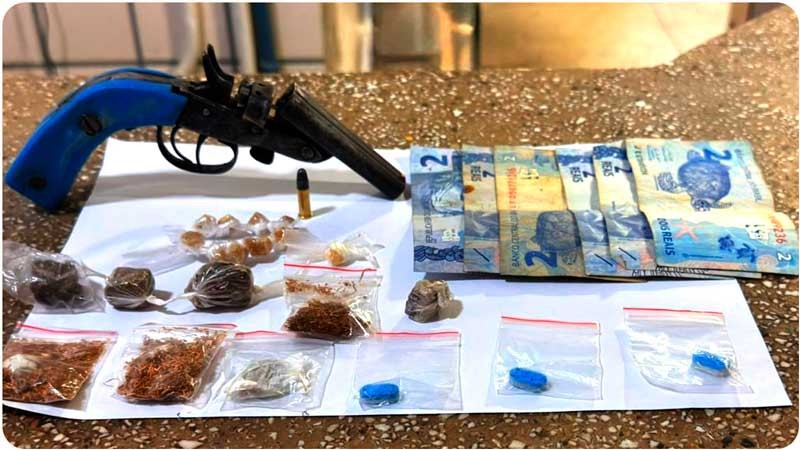Durante a busca no interior da mochila, foi encontrado uma garrucha Rossi, calibre .22 com numeração suprimida, um cartucho intacto, oito porções de maconha, 10 porções de crack, três comprimidos de ecstasy e R$ 10,00 em espécie.