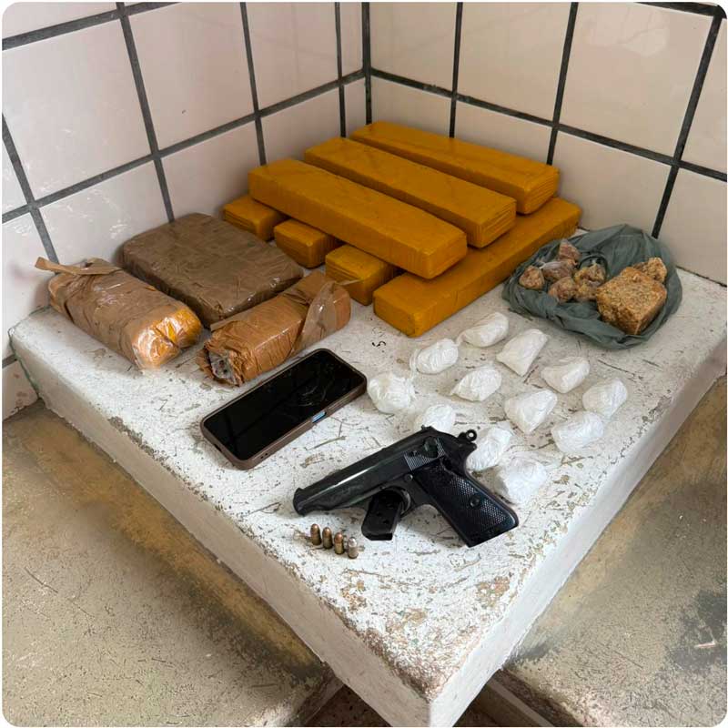 Após cessados os disparos, foi realizada varredura no local, sendo o suspeito encontrado caído ao solo, ainda com sinais vitais, portando uma arma de fogo em punho. Durante a busca no perímetro, foi localizada também uma embalagem preta, tipo saco de lixo, escondida sob um cocho utilizado para alimentação de animais, contendo grade quantidadede entorpecentes.
