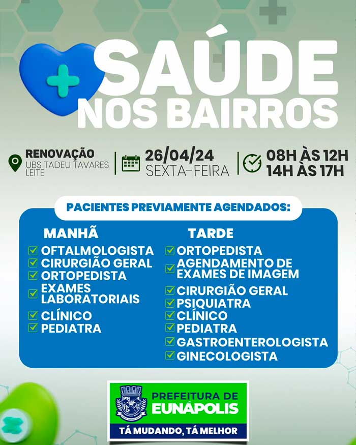 A UBS Tadeu Tavares Leite se prepara para o mutirão "Mais Saúde nos Bairros", nesta sexta-feira (26). Os moradores do bairro Renovação poderão fazer consultas de oftalmologia, cirurgião geral, ortopedia, gastroenterologia, clínico geral, pediatria, ginecologia, psiquiatria, exames laboratoriais, agendamento de exames de imagem e muito mais.