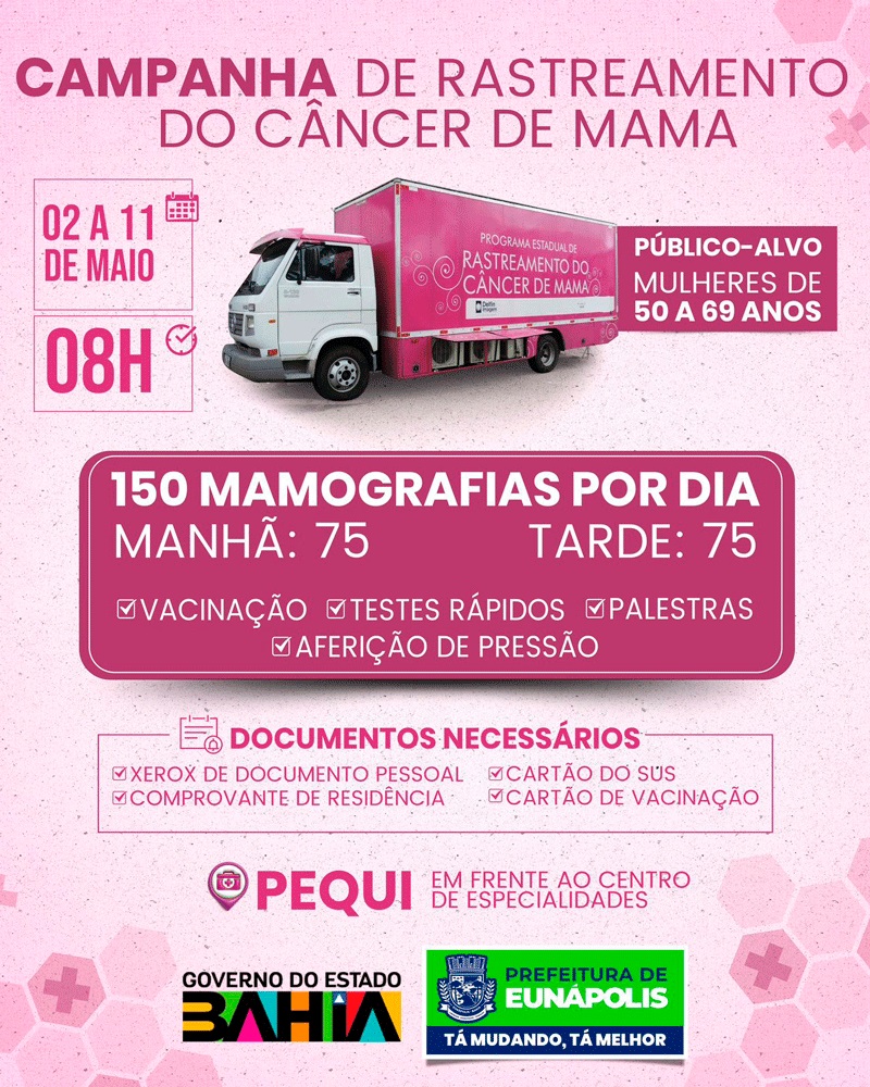 A Prefeitura de Eunápolis está apoiando a Campanha Estadual de Rastreamento do Câncer de Mama para mulheres entre 50 e 69 anos, que acontecerá nos bairros Pequi e Juca Rosa. A iniciativa oferece mamografias gratuitas e outros serviços de saúde, como vacinação contra gripe e testes rápidos. A ação tem o objetivo de incentivar a prevenção e o cuidado com a saúde das mulheres.
