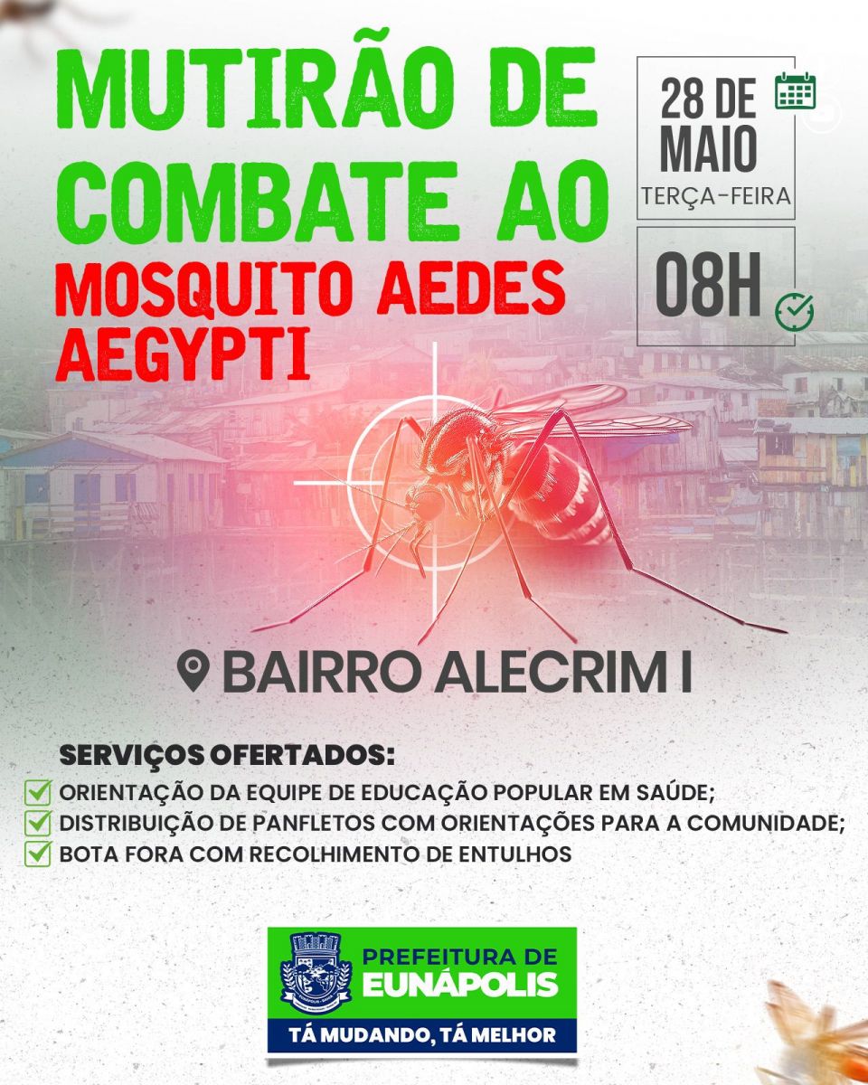 Nesta terça-feira (28), a Prefeitura de Eunápolis, através da Secretaria Municipal de Saúde, realiza um mutirão de combate ao Aedes aegypti no bairro Alecrim I. A ação envolve agentes de endemias que visitam as residências para identificar e eliminar focos do mosquito, além de orientar os moradores sobre como prevenir a proliferação do Aedes aegypti, transmissor da dengue, zika e chikungunya. Também será feito o bota fora com recolhimento de entulhos.