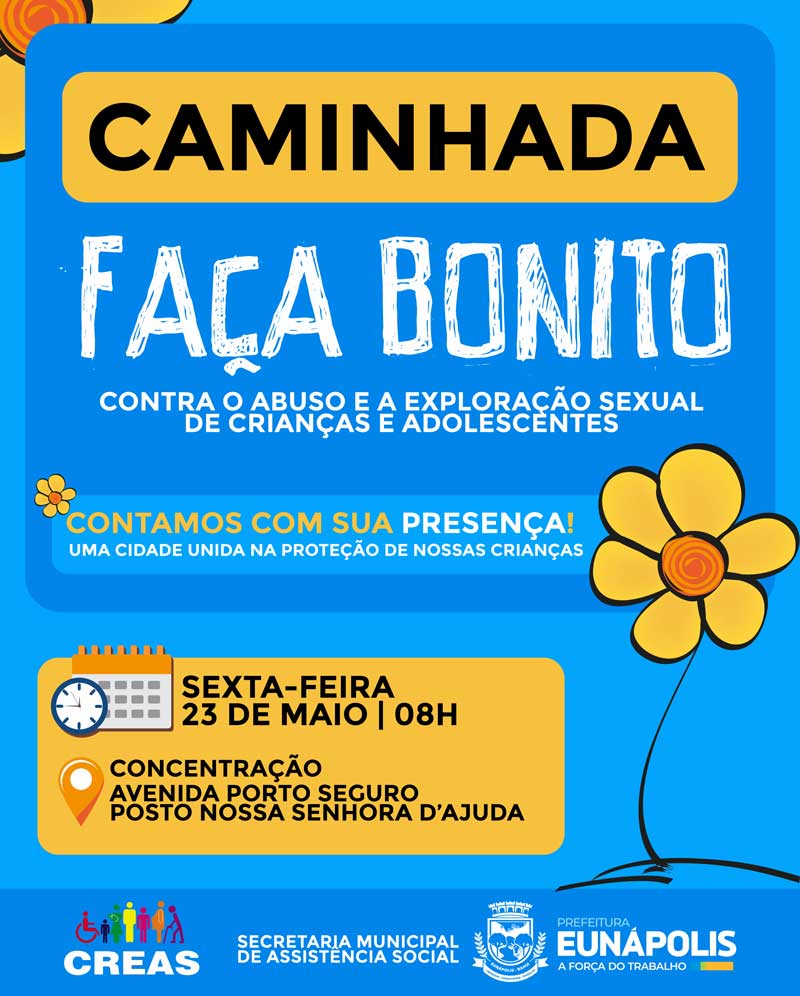 A Prefeitura de Eunápolis, por meio da Secretaria Municipal de Assistência Social, promove nesta sexta-feira, dia 23 de maio, a Caminhada “Faça Bonito”, uma importante ação de mobilização social pelo enfrentamento ao abuso e à exploração sexual de crianças e adolescentes.