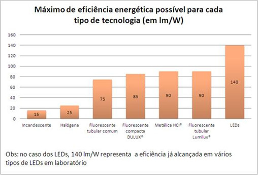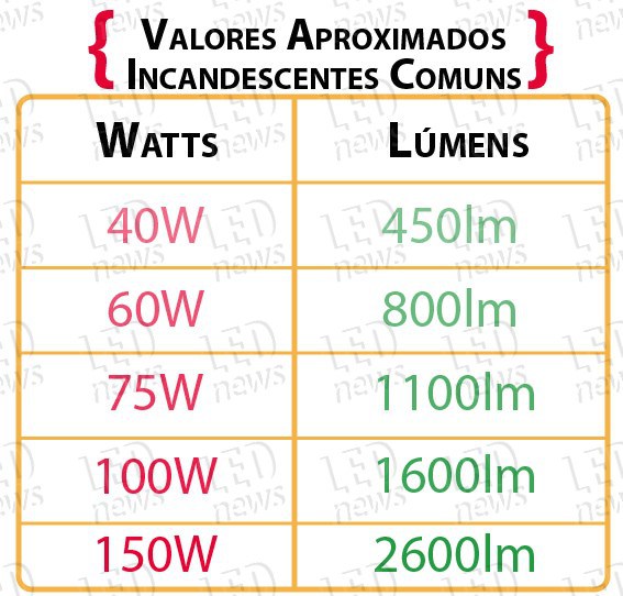 Uma lâmpada incandescente comum consome 60W para produzir 800 lúmens. Uma fluorescente compacta pode produzir os mesmos 800 lúmens consumindo apenas 15W. Lâmpadas de LED são ainda mais eficientes. Todas essas lâmpadas utilizam quantidades de energia diferentes para produzir a mesma quantidade de luz. As embalagens de lâmpadas devem mudar no futuro para se adequarem a essa nova realidade. Abaixo está uma tabela de valores em lúmens que lâmpadas incandescentes comuns produzem, para que na hora da compra da sua próxima lâmpada, voce já a escolha pelo número de lúmens que ela fornece.