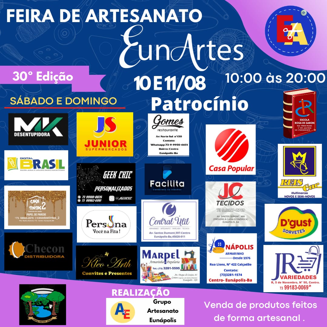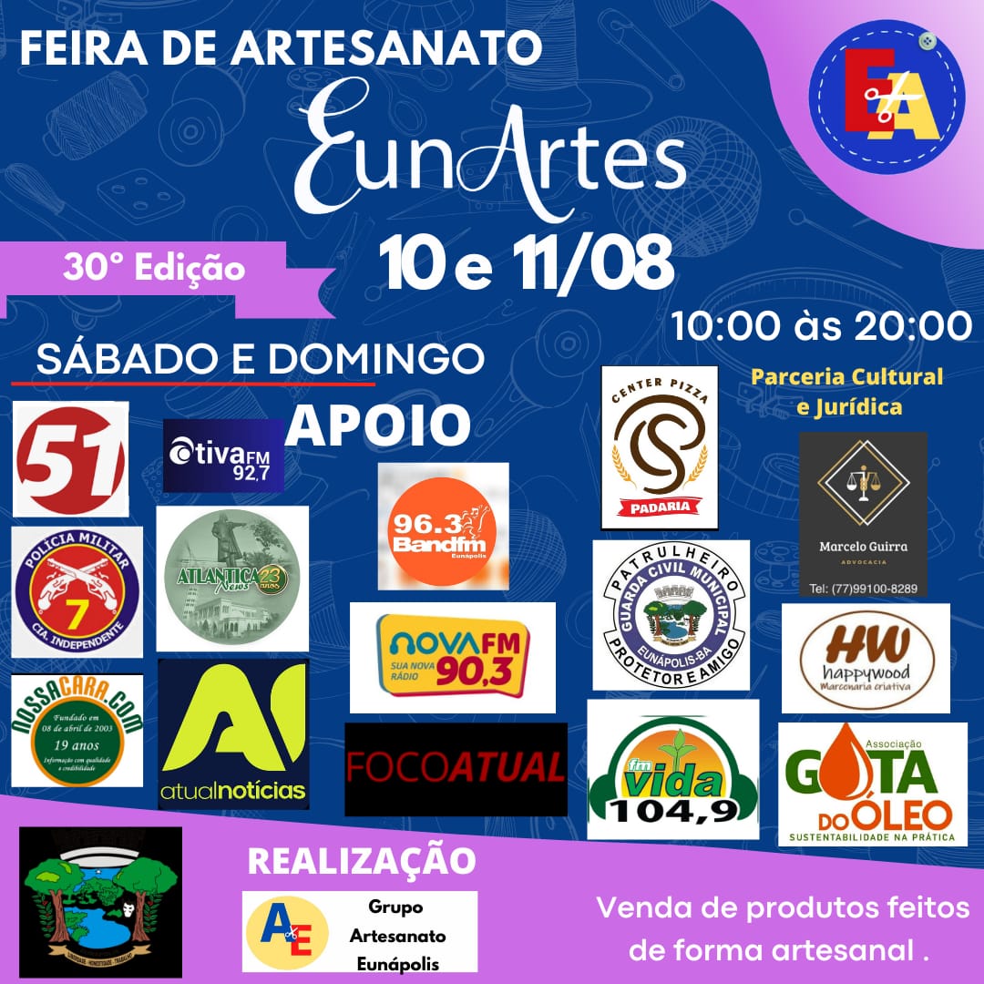 A 30ª Edição da Feira de Artesanato EunArtes de Eunápolis ocorrerá neste fim de semana, nos dias 10 e 11 de agosto. O evento, já tradicional na região, será um ponto de encontro para amantes do artesanato, com uma ampla variedade de produtos que exaltam a cultura local e a habilidade dos artesãos. Além de oferecer peças únicas e exclusivas, a feira é uma excelente oportunidade para apoiar a economia criativa da cidade e promover a valorização do trabalho manual.