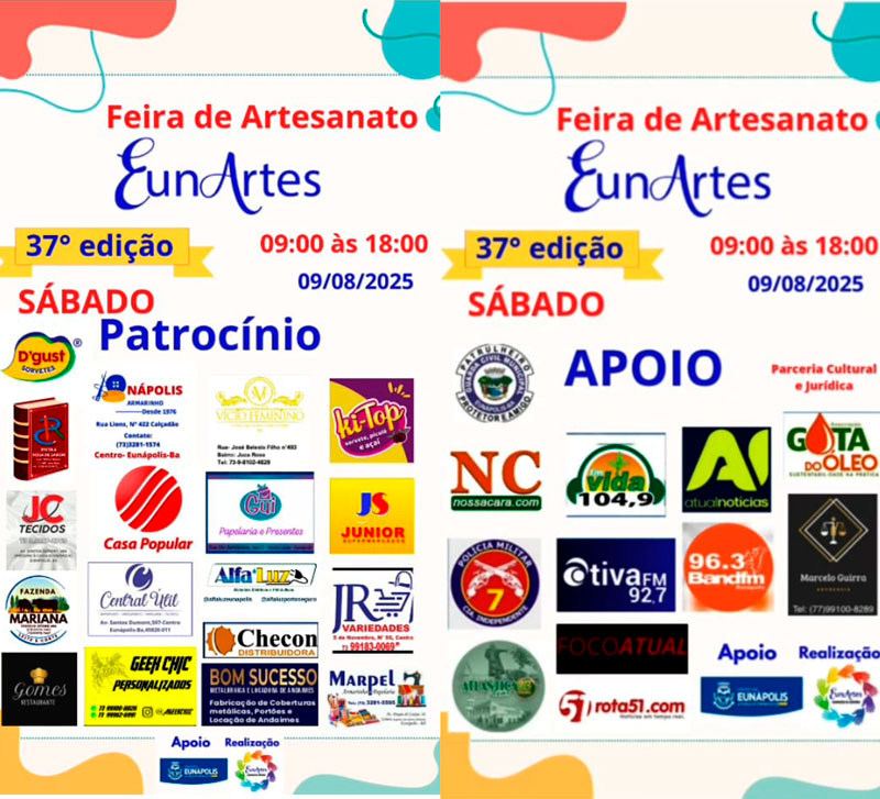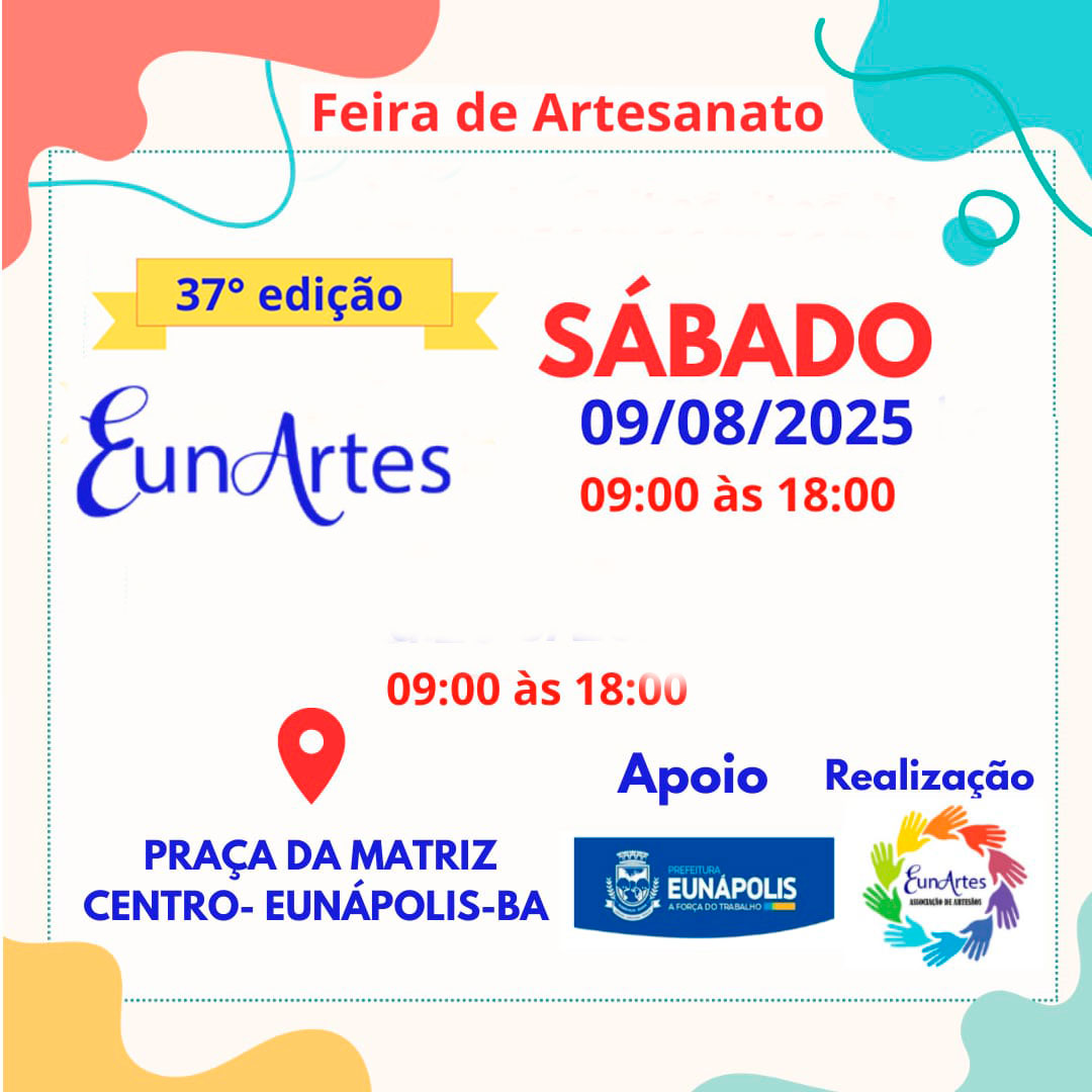 Neste sábado, dia 9 de agosto, a Praça da Matriz, no centro de Eunápolis, será palco de mais uma edição da Feira EunArtes — um evento que já se tornou tradição na cidade e referência na valorização da arte e do artesanato local. Das 9h às 18h, o espaço estará repleto de talento, criatividade e sabores que representam o melhor da produção artesanal da região.