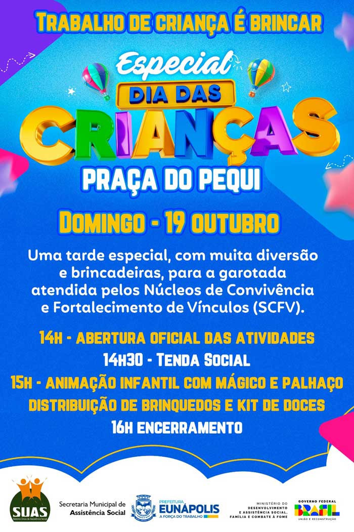 No domingo, 19 de outubro, a criançada atendida pelos Núcleos de Convivência e Fortalecimento de Vínculos (SCFV) tem um encontro marcado com a diversão! A Prefeitura de Eunápolis, por meio da Secretaria de Assistência Social, realizará uma tarde especial em comemoração ao Dia das Crianças, a partir das 14h, na Praça do Pequi.