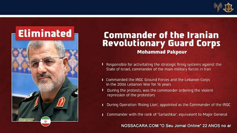 Mohammad Pakpour - Comandante do IRGC desde a Operação "Leão Ascendente" e um dos líderes do plano de "destruição de Israel". Como parte do seu papel, Pakour comandou a principal força militar do Irão e foi responsável por ativar as redes estratégicas de fogo contra Israel, bem como apoiar e dirigir os procuradores iranianos. Pakpour também liderou a repressão violenta dos manifestantes iranianos durante o último mês.