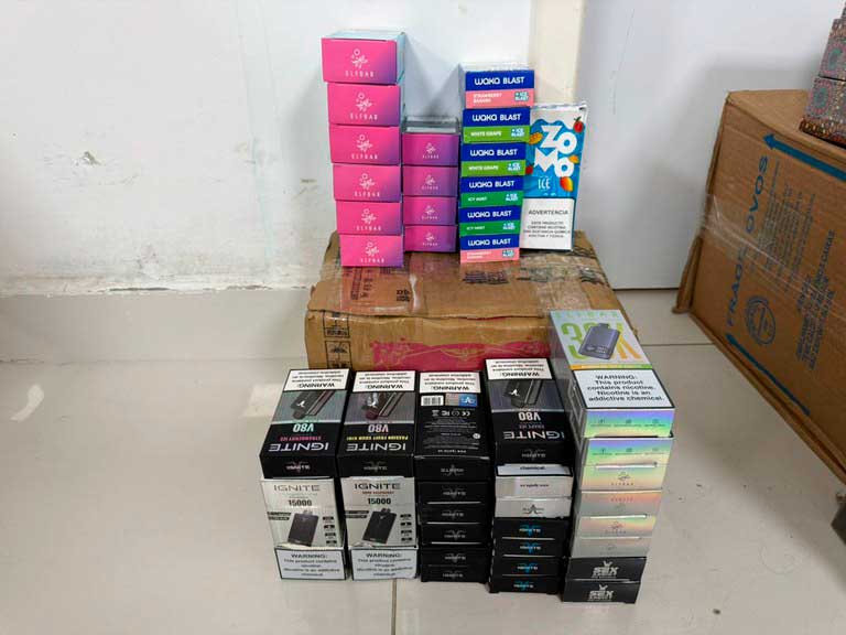 A fiscalização no mesmo ônibus de turismo também revelou uma carga de 147 dispositivos eletrônicos para fumar (vapes) e fluidos de recarga. Os produtos tinham como destino diversas cidades baianas, como Mutuípe, Santo Antônio de Jesus e Castro Alves.