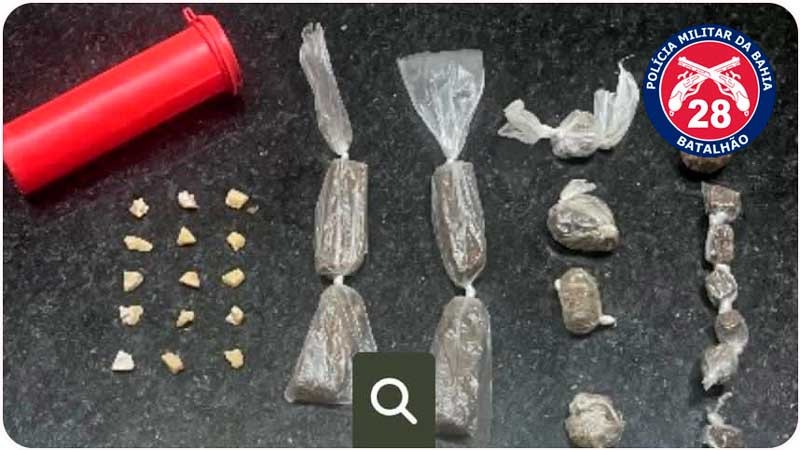 Durante a abordagem, os policiais encontraram com o suspeito um recipiente contendo material ilícito. O indivíduo e todo o material apreendido foram conduzidos e apresentados na Delegacia de Polícia para a adoção das medidas cabíveis.