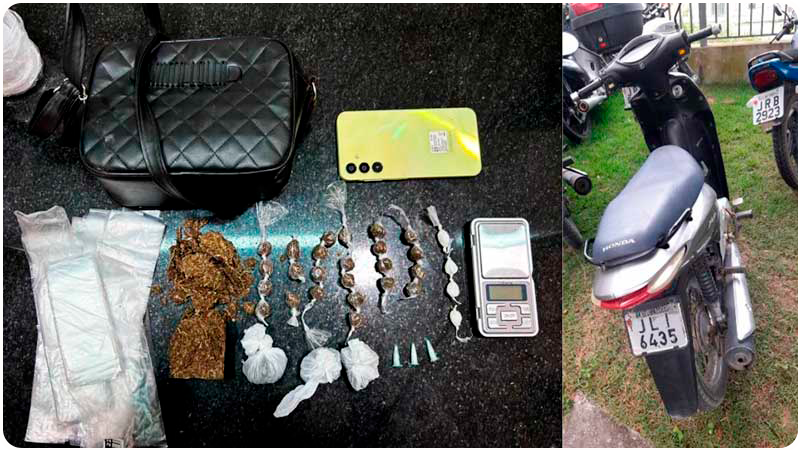A Polícia Militar da Bahia, por meio do 28º BPM/Eunápolis, realizou uma ação na manhã desta sexta-feira (10/04), por volta das 11h50, no bairro Minas Gerais, zona urbana do município. Durante rondas, guarnições avistaram uma mulher conduzindo uma motocicleta que, ao perceber a aproximação das viaturas, apresentou atitude suspeita e demonstrou nervosismo. Diante da situação, foi realizada a abordagem e, durante a busca pessoal, foi encontrado material ilícito em uma bolsa que a mesma portava. Ao ser questionada, a suspeita informou que realizaria a entrega da droga e indicou que havia mais entorpecentes em sua residência. As guarnições deslocaram até o endereço informado, onde localizaram o restante do material. A conduzida, juntamente com a motocicleta e todo o material apreendido, foi apresentada à Delegacia Territorial para adoção das medidas cabíveis, sendo constatado que já possuía passagem por tráfico de drogas no ano de 2024.