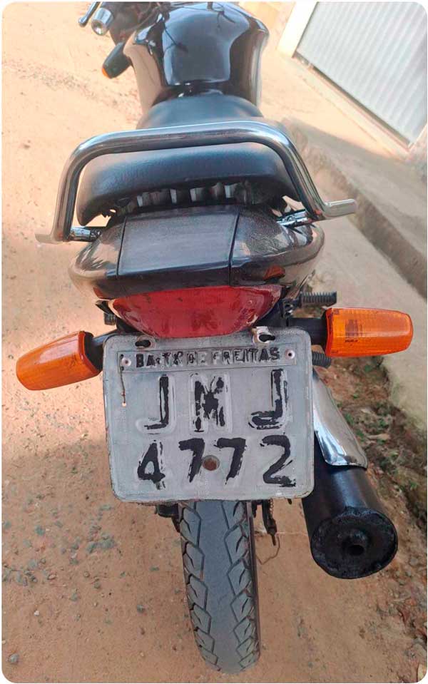 Uma guarnição da 87ª Companhia Independente da Polícia Militar (CIPM) realizava patrulhamento ostensivo na Avenida Bernardino Figueiredo, nas proximidades do Colégio Filhos de Maria, quando avistou dois indivíduos em atitude suspeita, trafegando em alta velocidade pelas ruas do bairro, em uma motocicleta com escapamento irregular e placa de difícil identificação.