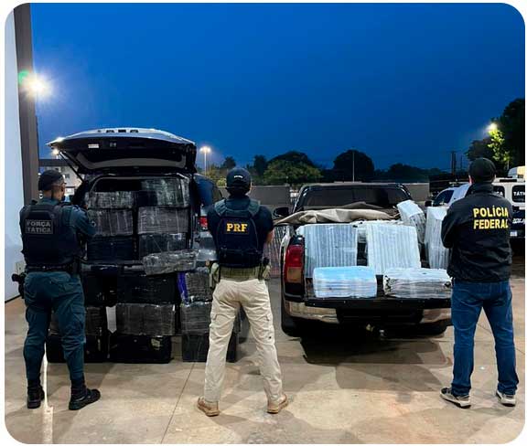 A Polícia Rodoviária Federal (PRF), a Polícia Federal (PF) e a Polícia Militar (PM) apreenderam 1.592 quilos de maconha e recuperaram dois veículos, no domingo (12/04), em Mundo Novo (MS).