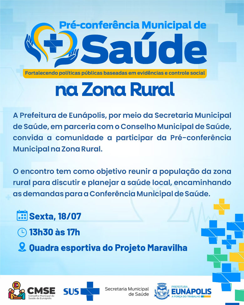 A Prefeitura de Eunápolis, por meio da Secretaria Municipal de Saúde e em parceria com o Conselho Municipal de Saúde, realiza nesta sexta-feira (18/07) mais uma edição da Pré-Conferência de Saúde, das 13h às 17h, na quadra esportiva do Projeto Maravilha.